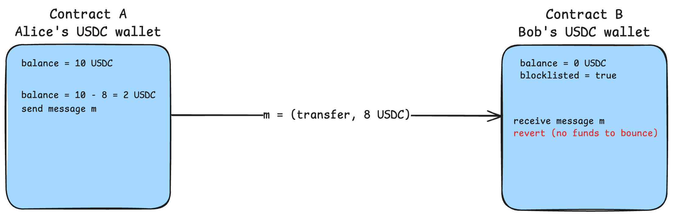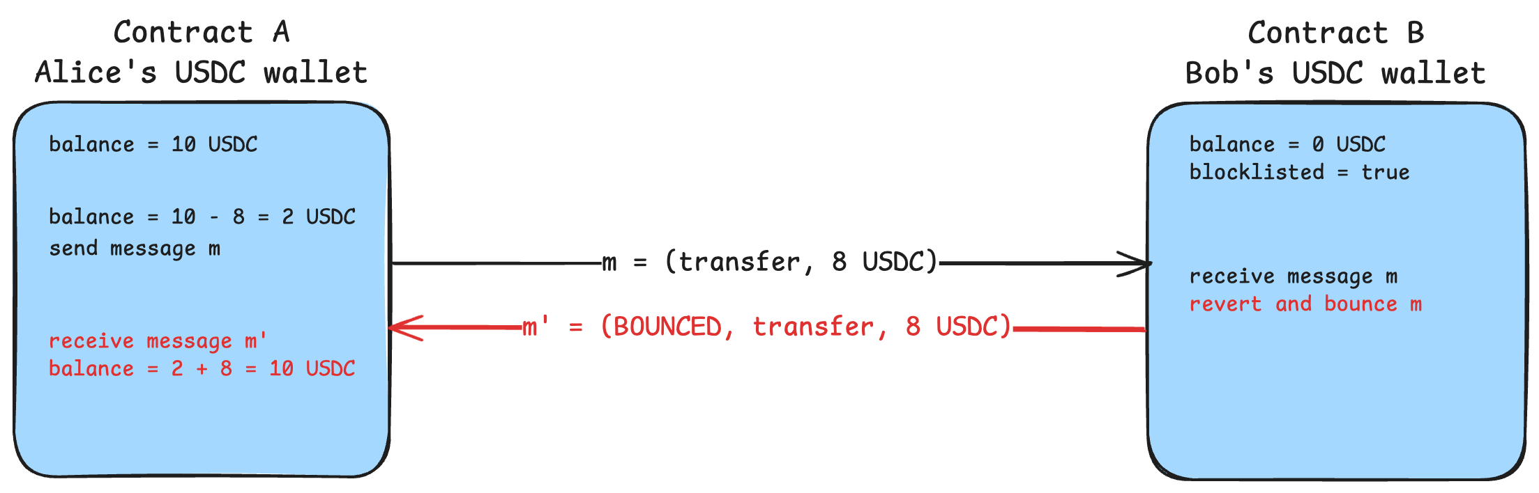- A receives m', detects that it is a bounced message from B, and undoes the transfer by computing balance = 2 + 8 = 10 USDC