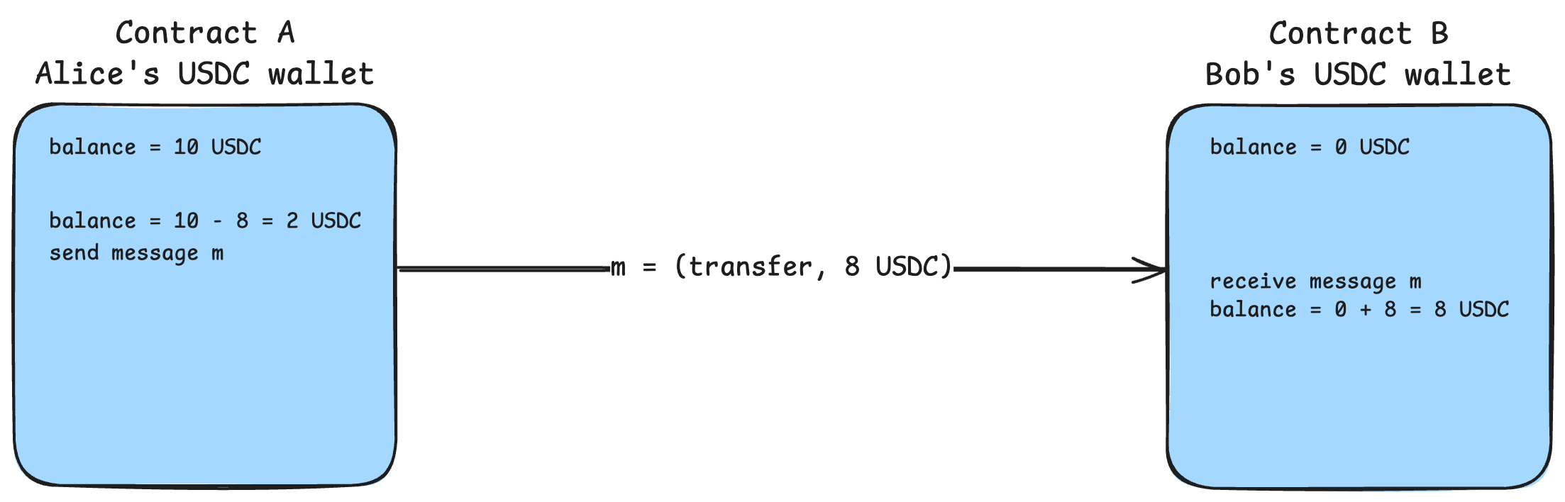 - As above, A sends a message to B. m = (transfer, 8 USDC)