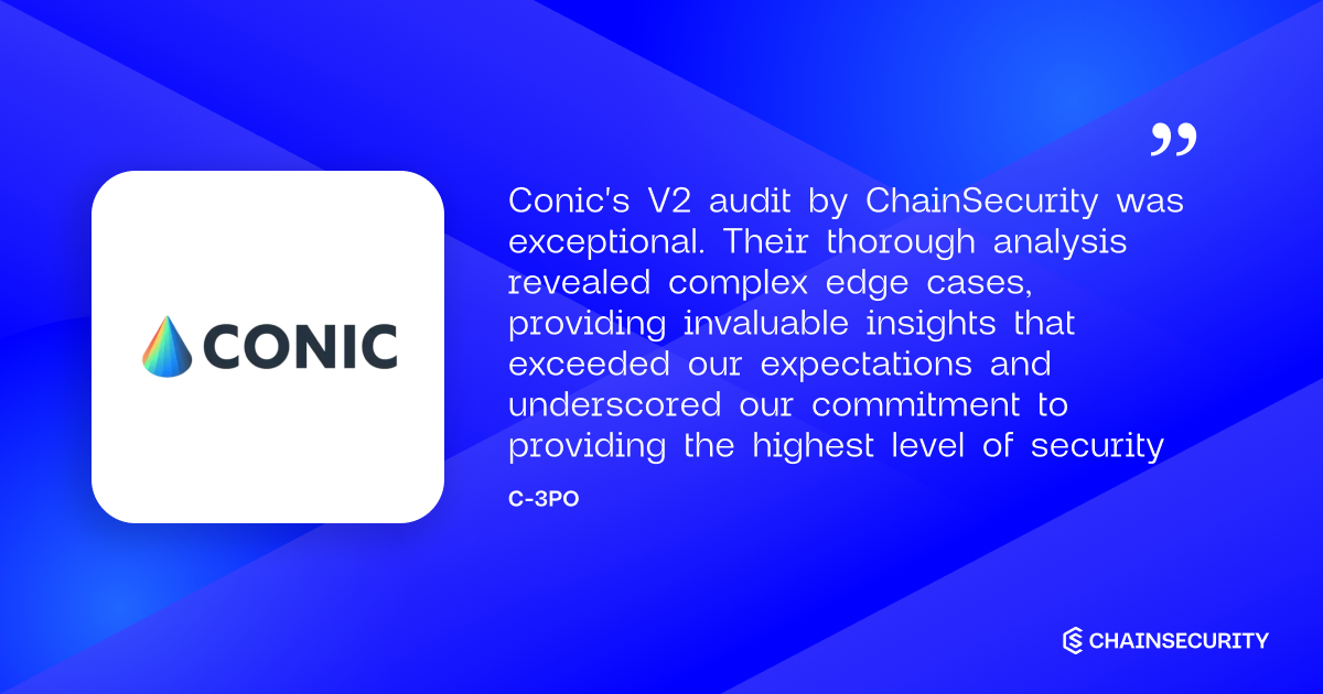 We have also conducted a deployment validation of Conic’s codebase. All security-relevant parameters of the deployed contracts as well as the evolution of these (starting from the block of the deployment of each contract until Ethereum block # 19127196) have been reviewed. All contracts have been deployed in accordance with our security audit. The deployment validation report can be found here: Conic protocol Deployment Validation by ChainSecurity