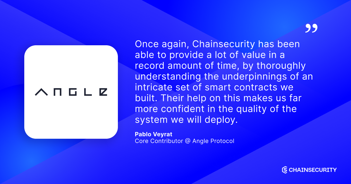 We uncovered one high and one medium severity issue. In the high severity issue a wrong variable is used as index. The medium severity issue is already public. Angle tweeted about it and fixed it in their code base. The remaining issues are of low severity. A few low severity issues remain acknowledged or partially fixed but all other issues including higher severity issues were fixed accordingly.