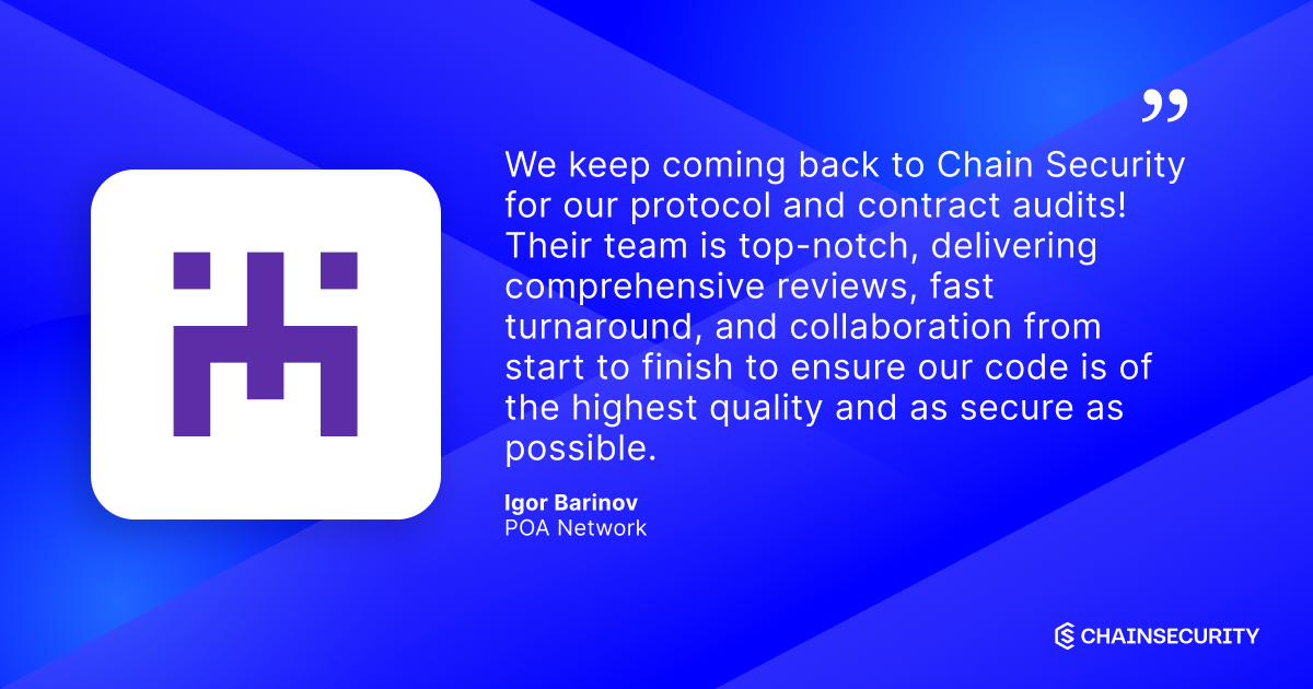 Overall, the ChainSecurity Ltd team found that POA Network is a very well-coded complex system with clean documentation. During the audit, several issues have been found by ChainSecurity Ltd and successfully addressed by POA Network. ChainSecurity Ltd sees no remaining security issues in the current version.