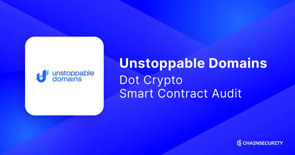 Unstoppable Domains engaged ChainSecurity Ltd to perform a security audit of Dot Crypto, an Ethereum-based smart contract system. The Dot Crypto smart contracts of Unstoppable Domains implements an on-chain naming system similar to ENS. Each Domain and subdomain is represented by an ERC721 token. Minting of SLDs can only be performed by Unstoppable Domains, it is centralized.