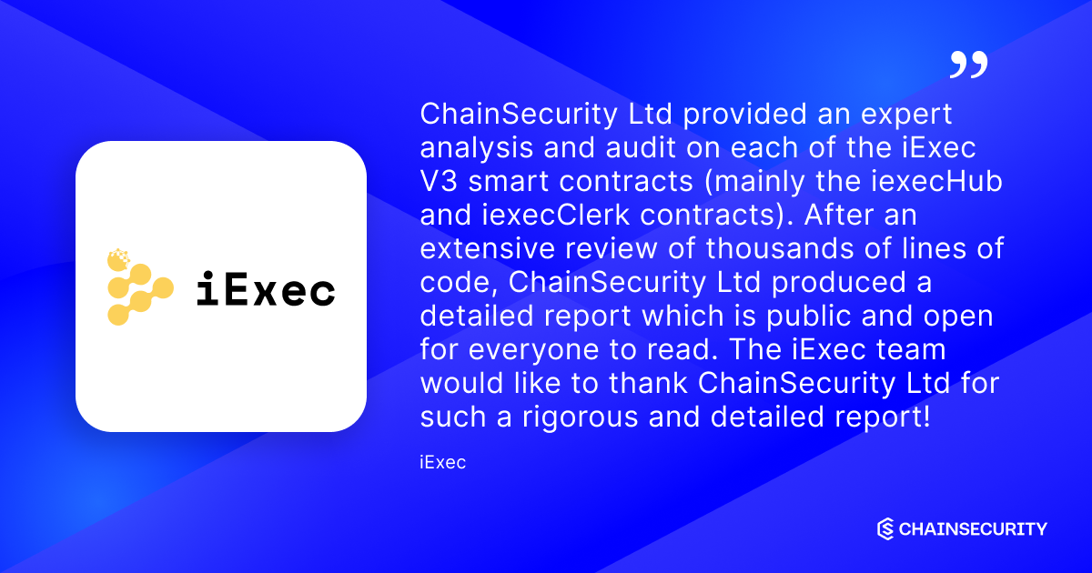 The iExec smart contracts constituting the Proof-of-Contribution protocol have been analyzed under the agreed upon specification, with different tools for automated security analysis of Ethereum smart contracts and manual review. The issues listed in this report result from ChainSecurity Ltd’s verification of this specification and should not be considered exhaustive.